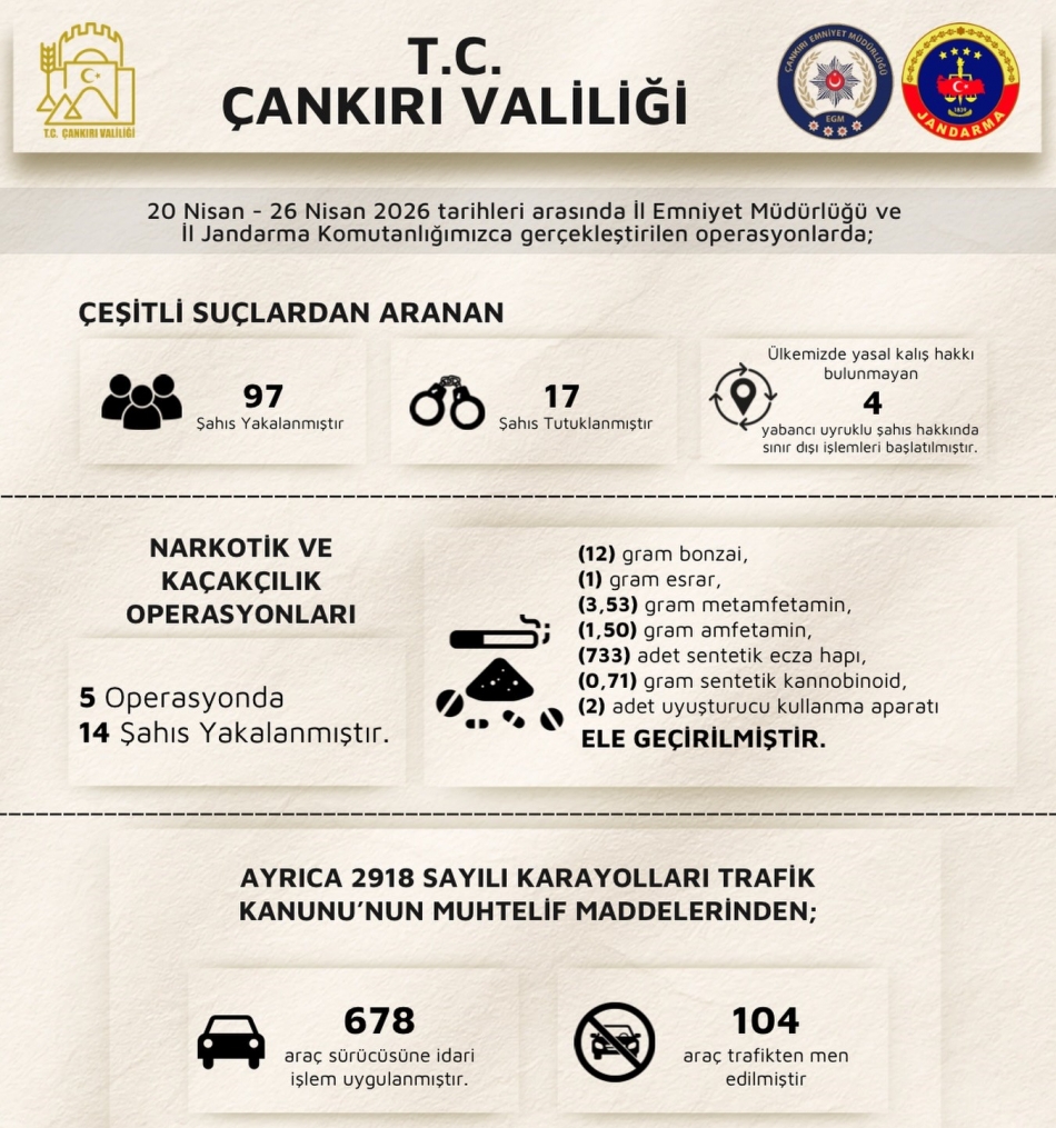20-26 Nisan 2026 tarihleri arasında İl Emniyet Müdürlüğü ve İl Jandarma Komutanlığı ekiplerince gerçekleştirilen operasyonlarda çeşitli suçlardan aranan şahıslara yönelik önemli çalışmalar yürütüldü.